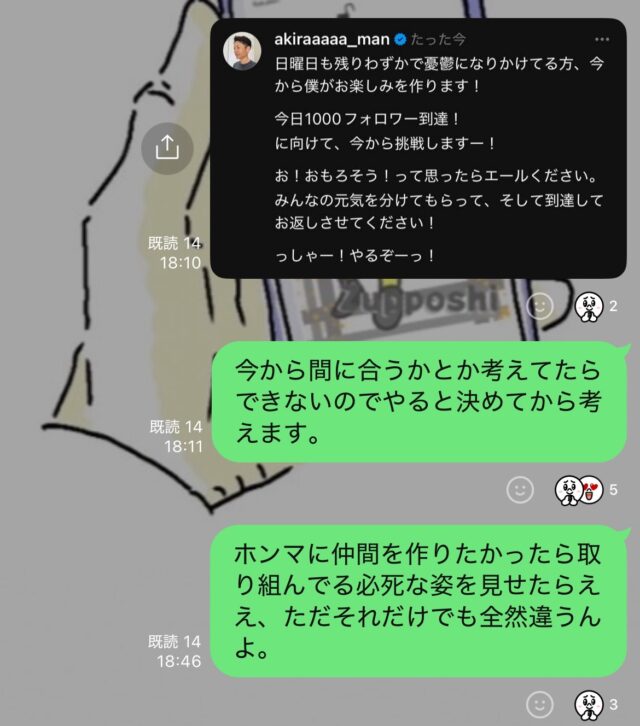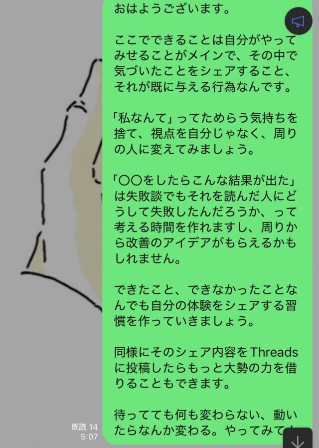 僕のオープンチャットは背中を見せて刺激を与える環境です。僕からのメッセージは基本的に、行動と振り返り、動けない、どうしたらいいかわからない方に向けて背中を押すような内容を送っています。